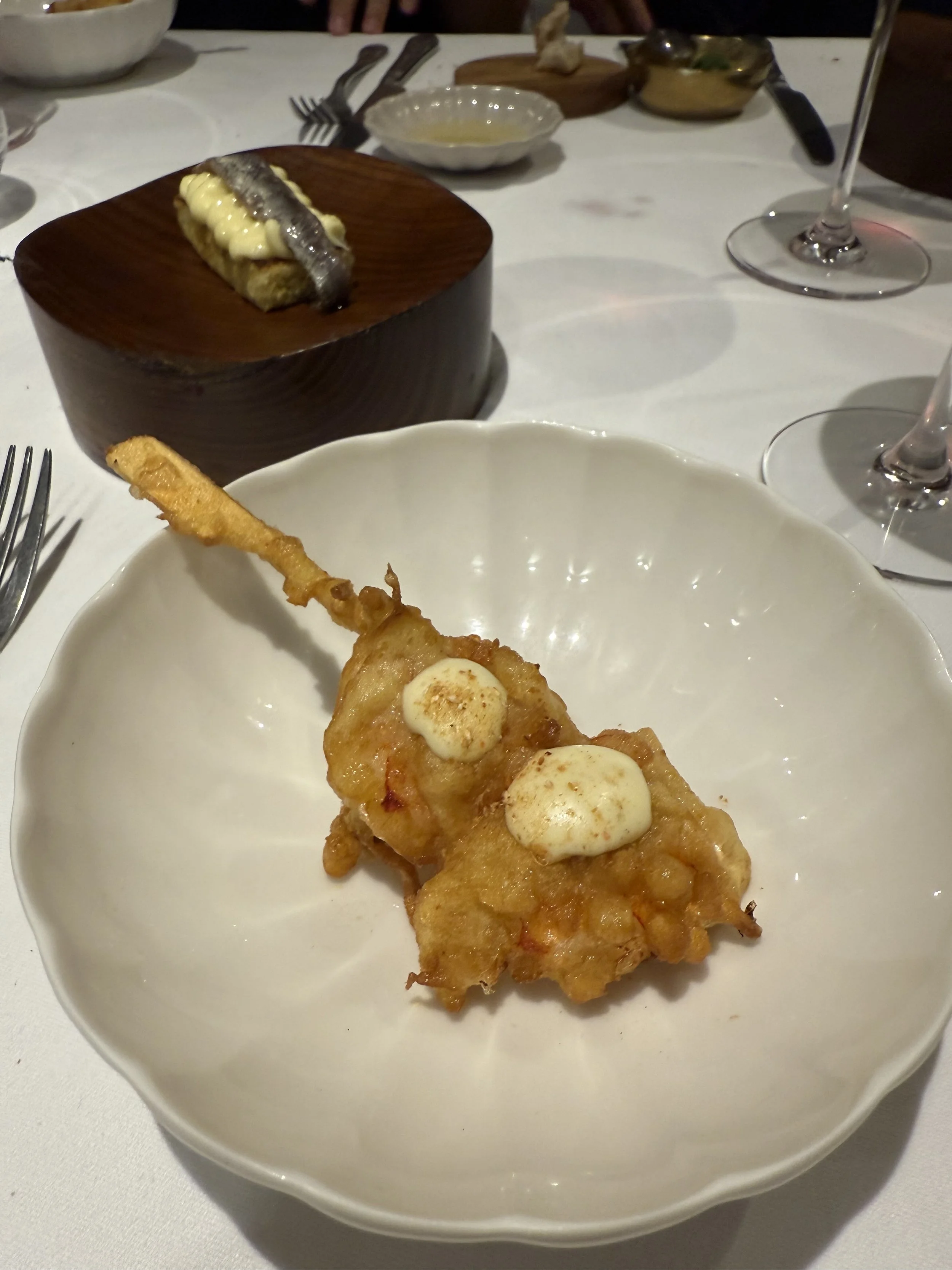 Like this gamba en gabardina, or shrimp in a raincoat, a classic pintxo around here, in what is just a perfect tempura, topped by a mayo made with its own juices.